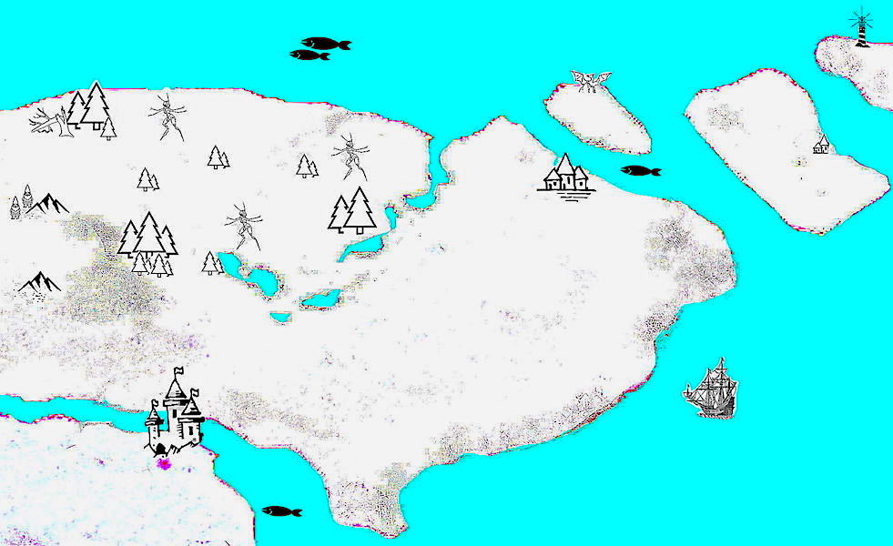Deciding that they still don’t have enough money to pay for Auntie’s nearby magic-concentration services, The Red-Gold Company moves to complete the rest of their map-update quest. They sail past the small island, which contained the Dragon Icon on Yrsa’s map, but see nothing of interest. Likewise, as they cruise west along the northern shores of Kraldjur and Krossad, they see nothing much of interest in the mostly-peaceful elvish lands to satiate their adventurous tastes. Although, Stroop starts to feel a little uneasy after first breakfast. As all food agreeds with him, he believes he’s gong up a level in experience. All of the party has, and they return back to Kuststad to report their findings to Commander Holt, who gives them eight days of vacation so that they can train up and acquire new skills.