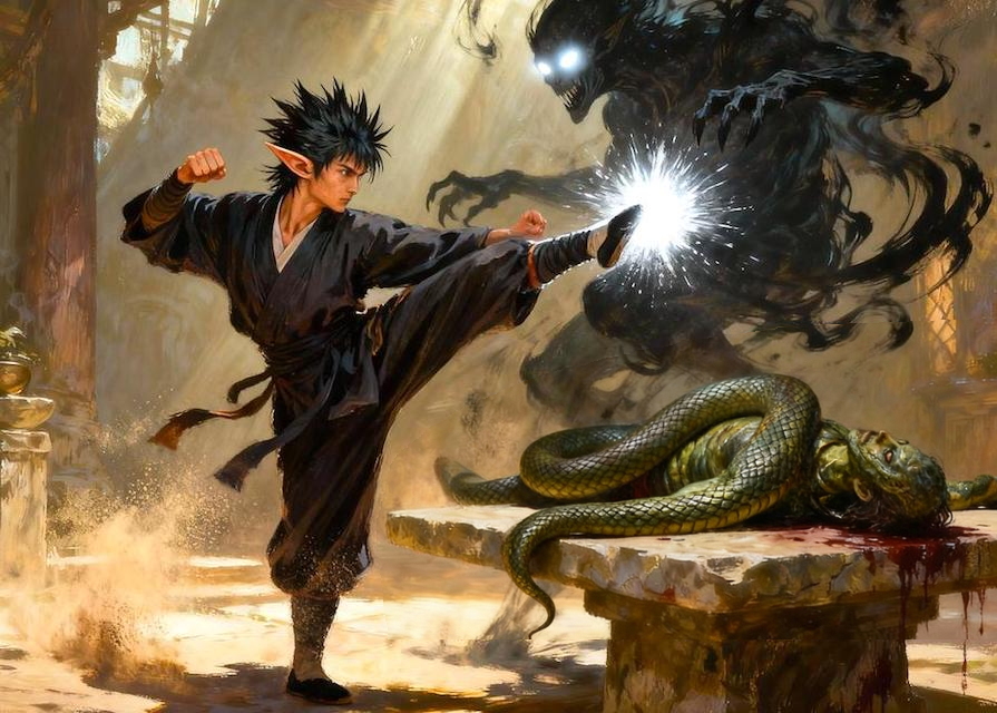 Stymied in their attempt to get any useful information from the Yuan-Ti cleric, Sagon ritually executes him. As he does so, though, one of the white eyed, smiling white-tooth dark spector-like creatures rises out of his corpse, laughs at the party, and begins to fade away in front them as others of his kind have, but, reacting quickly, the monk—now at a level where he can strike supernatural creatures with his bare hands—is able to rapidly kick and stun the screaming creature, doing enough damage to “kill?” it and causing it’s phantasmal body to disrupt and crumble into a black powdery dust, which The Company collects into a small jar for later analysis.