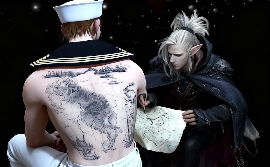 Meanwhile, Viggo, left in charge of the fishing boat docked back at Orlane, finishes up making deliveries of the trade goods and fresh catfish that Captain Kruesh arranged to sell locally. And, as Orlane is a new village, and not on any of Viggo’s maps, the cartographer spends extra time leisurely walking the dirt paths, using his consistent stride to take reasonable measurements of the place. Busy as such, and stepping near the western edge of the settlement, he goes unnoticed by two men who Viggo sees skulking around a house near an old well. Likwise using stealth, Viggo moves up closer to see what they are up two. And, this includes one of them uncoiling a long length of rope (marked off in foot increments with white paint), and the other stripping off his clothing down to his skivvies. Before the nearly nude man disappears down the inside of the well, Viggo cannot help by notice that his arms, upper legs, and back bear colorful tattoos resembling a map.