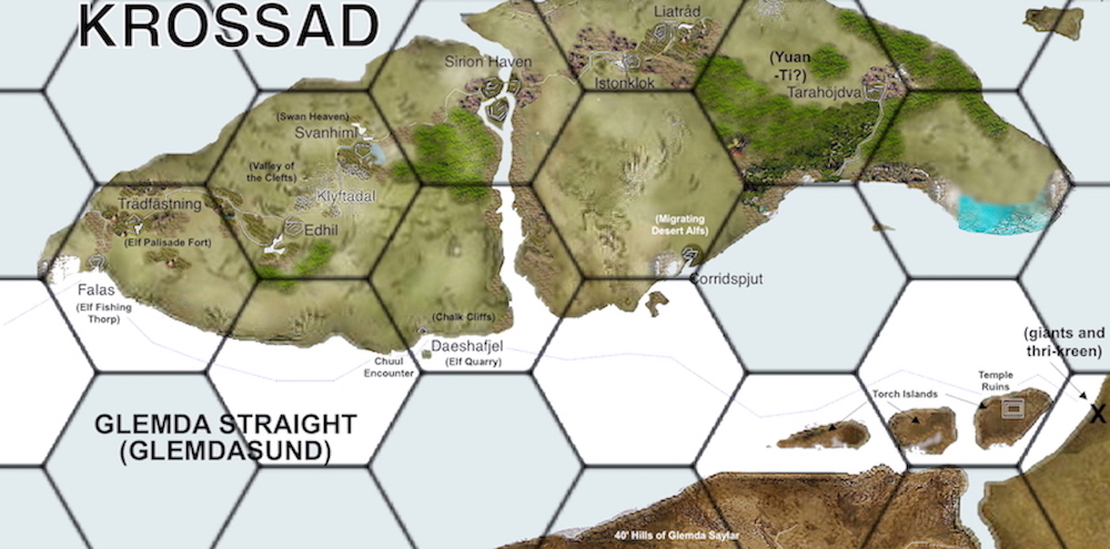The Company loads up fishing supplies, would-be smuggler goods, and a barrel of apples that Yrsa bought for Stroop onto the fishing boat, and they set off at dawn on the 48th day of the campaign (technically it’s day 12 of Värmskörde, the warm harvest season of the year). Sailing east beyond their normal patrol areas for the first time, they head first to the western end of Krossad, specifically to the small elven fishing thorp of Falas. The community of High, Light, and Wood Elves is found to be friendly, and a small amount of goods are exchanged between them. Beyond the wooden docks and huts around the shallow harbor, Viggo (with the aid of his 5x power luggable telescope) discovers the elves have a fallback defensive location a mile or so back in the hills. This, they learn is called Trädfästning, fortified huts protected by a palisade of sharp-cut timbers. Conversions and performances made with and for the locals yields additional information about nearby landmarks and elven thorps: Klyftadal (The Valley of Clefts), Edhil, Svanhimel, and the chalk mining community of Daeshafjel.