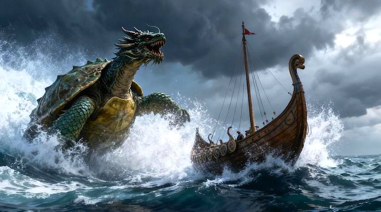 Kruesh and Viggo, meanwhile, are doing their best to sail the Silver-Rose away from the creature, who recharges its breath weapon immediately and scalds the crew of the Meerpaard after first swimming very quickly towards the longship. The Meerveulan and Golf Snijder crews manage to hit the turtle with ballista bolts, and several of the Meerveulan crew members launch arrows. Will Paree hits the dragon with a green beam of energy, which carves into the monster and does considerable damage. (Timador believes he’s just witnessed a Disintegration spell in action. Yrsa then notes the cleric on the Golf Snijder also hit the turtle with a powerful dark necrotic spell, possible a Harm spell. And, the Ökenveld ships move in closer, but they are still too far away to join the battle. Eventually, through the combined efforts of all four crews of the Svarta ships, the turtle is slain and then harvested for its meat and internal organs.