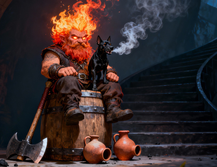 The singing is coming from Karlo “the Barely Enormous,” a Dwarf Fire Giant guard, “just” ten feet in height. The guard is drunk on an algae and koji fungus brew and is rather despondent, his only friend, a young Hell Hound pup named Davorin. Karlo has been stationed here, essentially in an insulting/worthless position, guarding a remote passage from which there should have been little to no chance of anything ever needing to be repelled. As Karlo has failed at physically repelling these surface adventurers, he takes a different approach to his duty. Since the party had stealthily removed his gold-inlaid throwing boulders before revealing their presence to the giant, Karlo attempts to block their passage further inside by outright warning them of the Ettins and Fire Giants who lay beyond his post, knowledge of which gives the party pause, as they’re not certain they’re up for a fight against several giants. Karlo inquires if the surfacers have any wheat bread or sugar, and, after Sagon gifts the giant his cask of honey mead from the Portable Hole, Karlo warms up further to the party, and he relates how the Fire Giant Jarl beyond and above has been “dangerously stoking up the place” lately to create adamantine armor. From there, the conversation leads to discussions of sun-grown grains and the possibility of making the giant some fresh bread in the Ziggurat above. Lured into such a promise, while also not truly believing that caverns below him lead anywhere up, Karlo travels with them to the surface. Along the way, they battle with another spore bag, three animated bone clusters, and fight some coral creatures, which attack, after the Company direct the Fire Giant to smash some of the coral growing through the black portal so that he will have room to squeeze through. While Sagon is pounding on the largest coral creature, the rest escape up the coral mound into the Ziggurat.