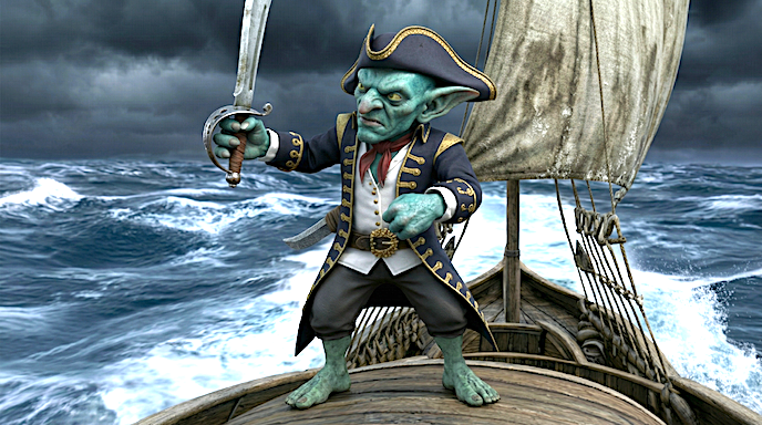 As the newly-form island begins to quake and settle and/or sink, and as five ships approach them, the Red-Gold Company hurry down the rocky slopes and return to their ship, the Silver-Rose. Viggo has used his telescope to make out details about the approaching vessels; this, combined with the previous experiences of his fellow party members indicate that two of the three ships sailing from the west are the longship Meerpaard and ocean knarr, Meerveulan, military patrol ships from Fort Mouth. The third, a long, thin ocean-going knarr, carries the name Golf Snijder and is later found to have originated from Messersachs. All three have been dispatched to investigate the new island (and source of the recent flooding). Most of this is learned from the skipper of the Meerpaard, Will Paree, who speaks to the party through the mouth of a Pseudo Dragon (“Sgt. Rembrandt”), who has flown ahead to caution The Company from attacking either of the approaching Ökenveld ships (the Denizyilani and the Engerek).
